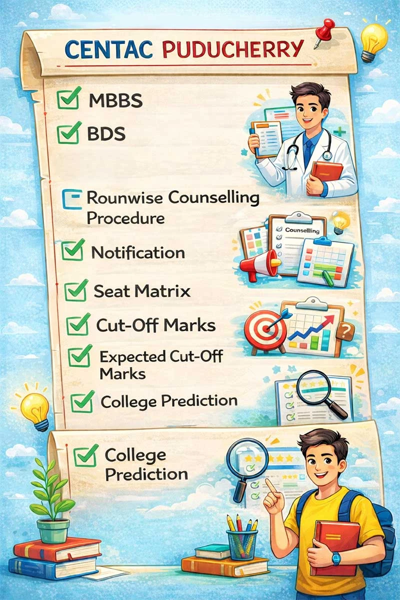 Puducherry (CENTAC) Counselling is the centralized admission process conducted by the Centralised Admission Committee (CENTAC) for MBBS and BDS seats in government and private medical and dental colleges of Puducherry. Admissions are based on NEET UG rank, eligibility criteria, and reservation norms.